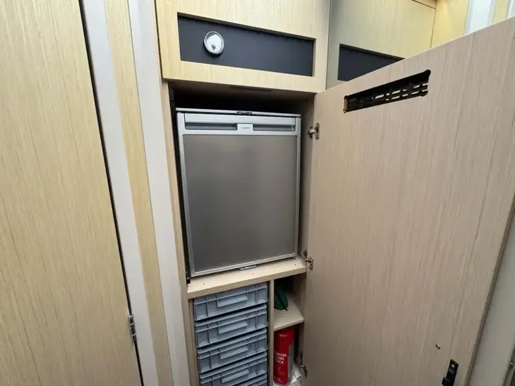 - In the main saloon area there is also additional storage, an extra fridge and fresh water tank level indicator