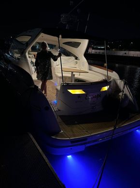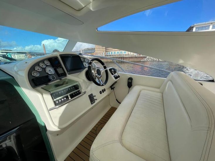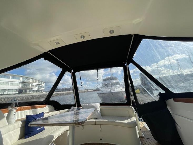 Escape comes with all the desirable fittings including the teak laid bathing platform and cockpit floor, spacious seating area, opening sunroof, bow thruster, stern thruster, trim tabs, fly-by-wire throttle system and more besides.