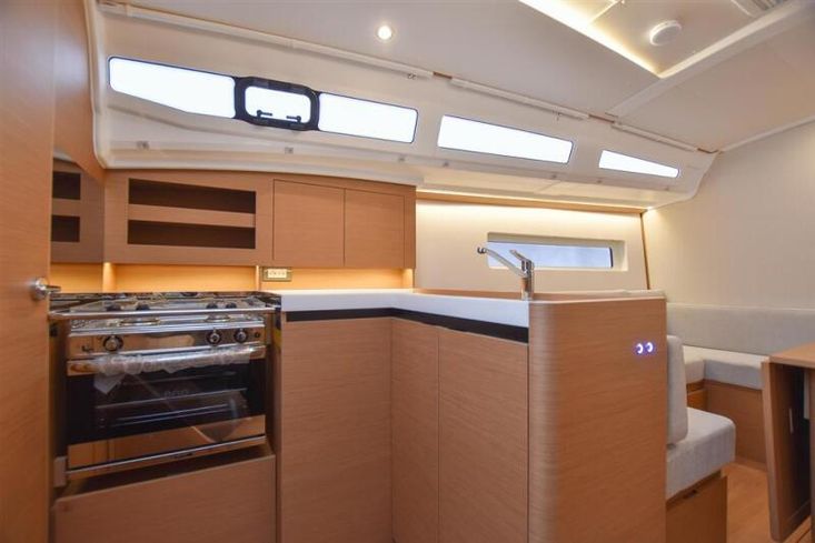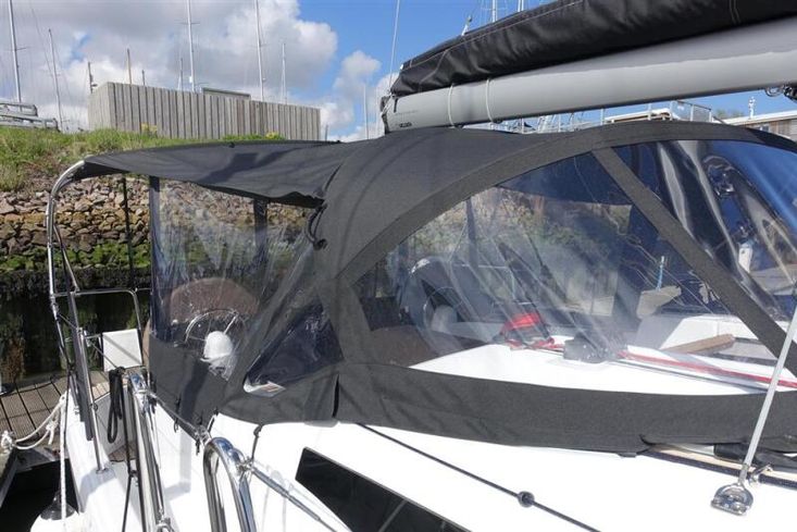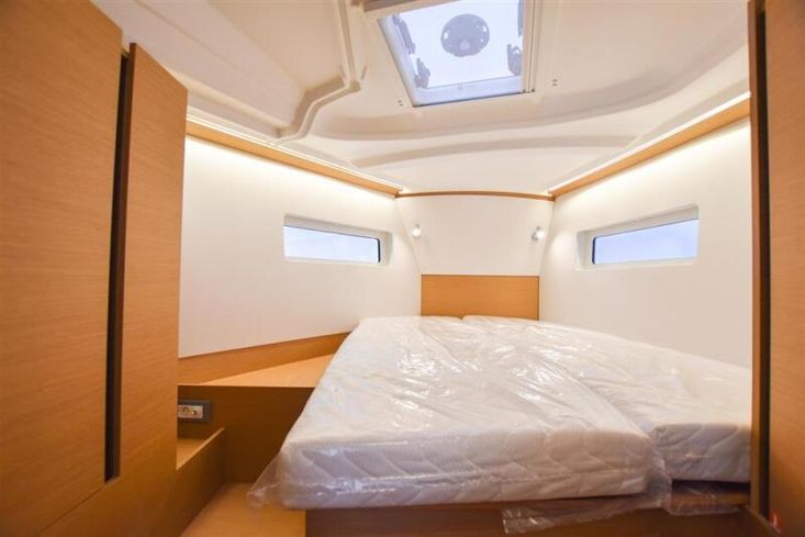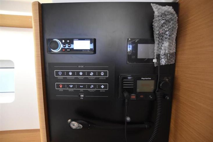 Four large hull ports, many opening ports (including 3 in the aft cabin) and flush deck hatches. 12V USB plugs in cabins. Indirect lighting, lamps on bulkheads, RA70N fusion player (radio/USB/Bluetooth) with saloon and cockpit speakers, upholstered bulkheads, shades and blinds for windows and ports, under floor wine storage, clock and barometer, extra porthole in aft cabin.