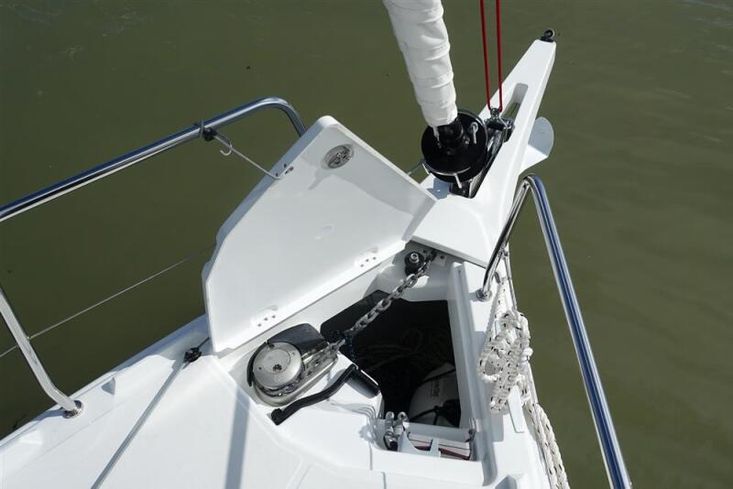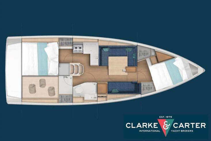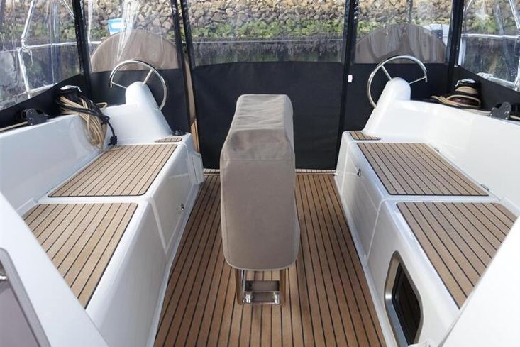 White grp hull with style stripes. Full length hull chine with negative angle and flying bow to extend the waterline and prevent slamming. The large beam at the waterline gives a shallow hull (less wetted surface are), more buoyancy forward and a more powerful sailing hull shape. White grp coachroof with moulded non skid decks. Walk around side decks, unique to Jeanneau. Self draining cockpit and anchor well. Integrated bowsprit with central anchor roller, Code 0 and asymmetric tack points. Teak to cockpit seats, fold down swim platform and cockpit sole. Twin wheels to twin rudders and self aligning rudder bearings. Cast iron keels. Flush deck hatches.