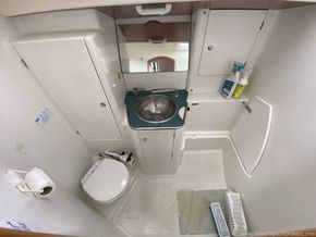 Separate WC compartment with sea toilet, washbasin and shower, hot water system