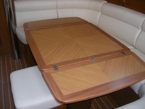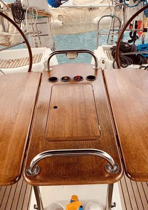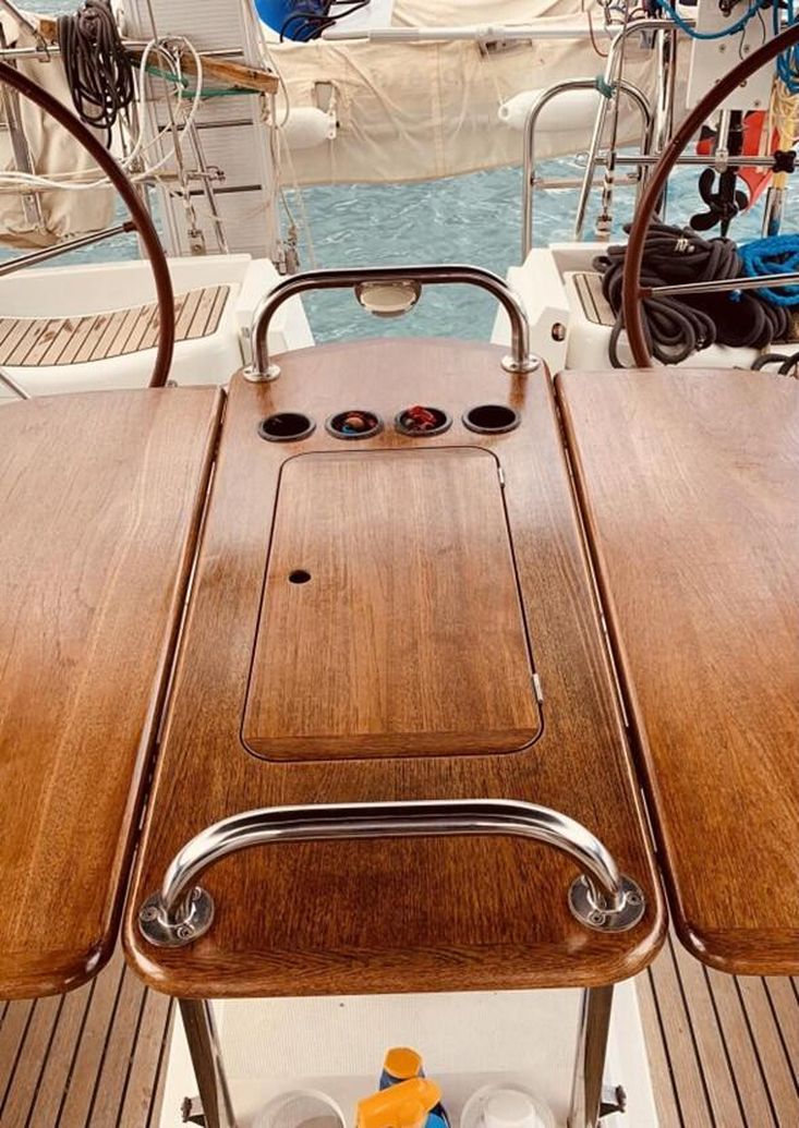 Teak folding table in cockpit