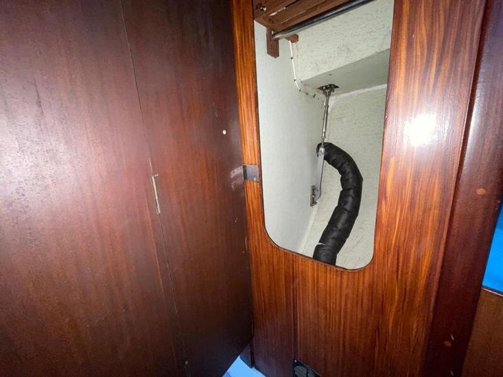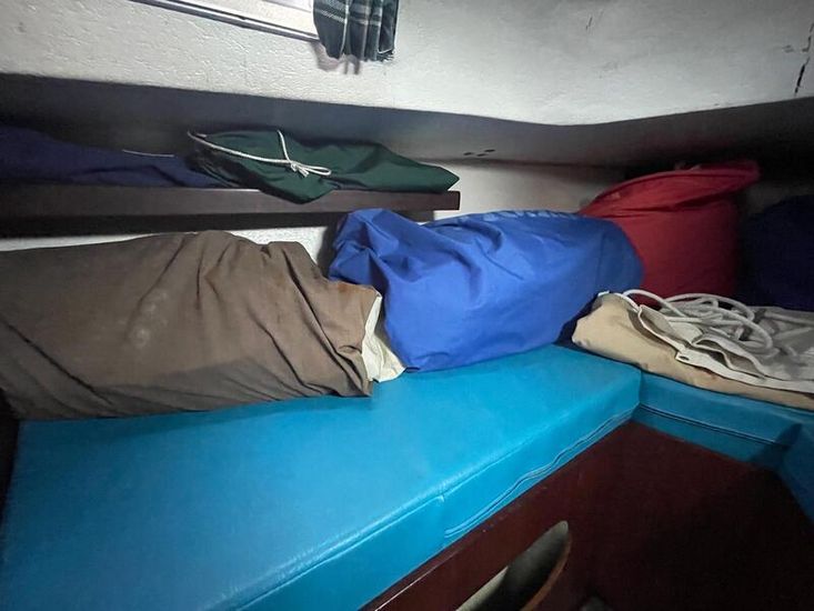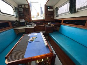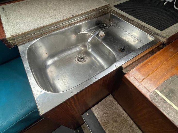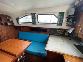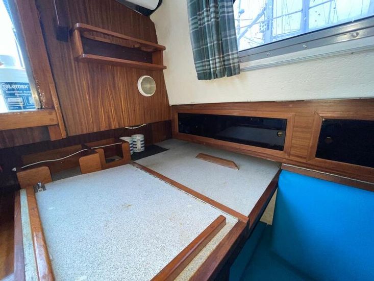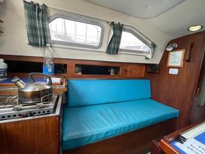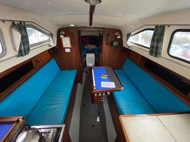Well-proportioned saloon with standing headroom, double V berth forward separated from salon by heads on the starboard side and locker to port. The heads can be pumped directly out to sea or to a holding tank with shore or sea pump out facilities. All upholstery in good condition. The galley comprises of an Origio 3000 2 burner Spirit hub and stainless-steel sink with 12volt pump, the cool box has been converted to a refrigerator with a Webasto Evaporator and compressor in the starboard cockpit locker. The main saloon and fore cabin are heated by a Webasto warm air system. There is a cockpit table which folds flat when not in use.