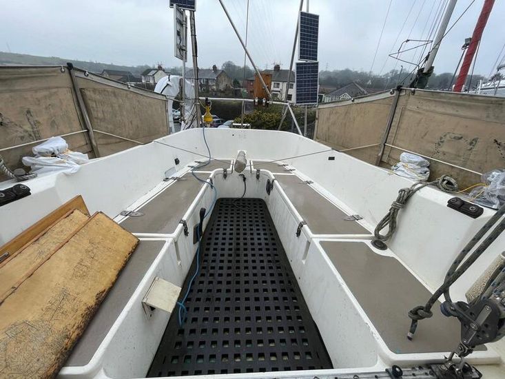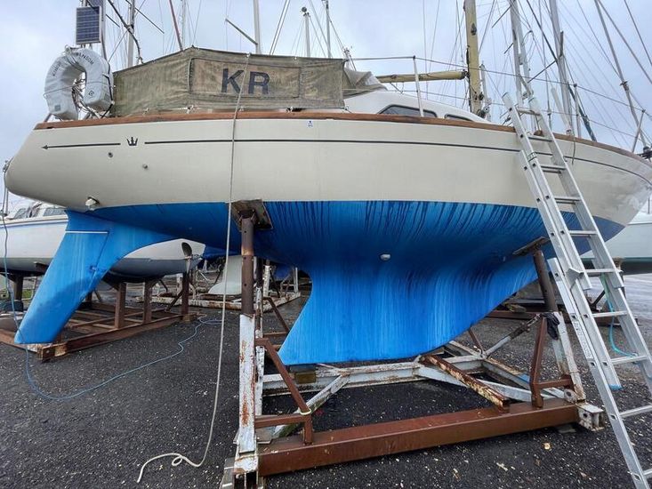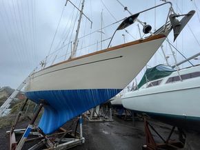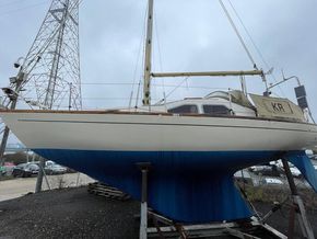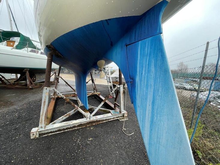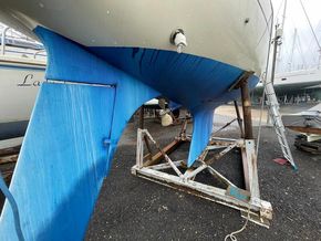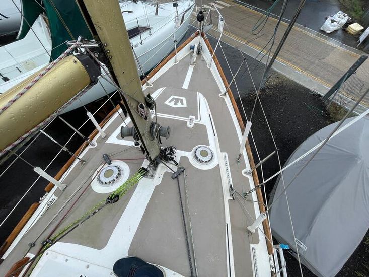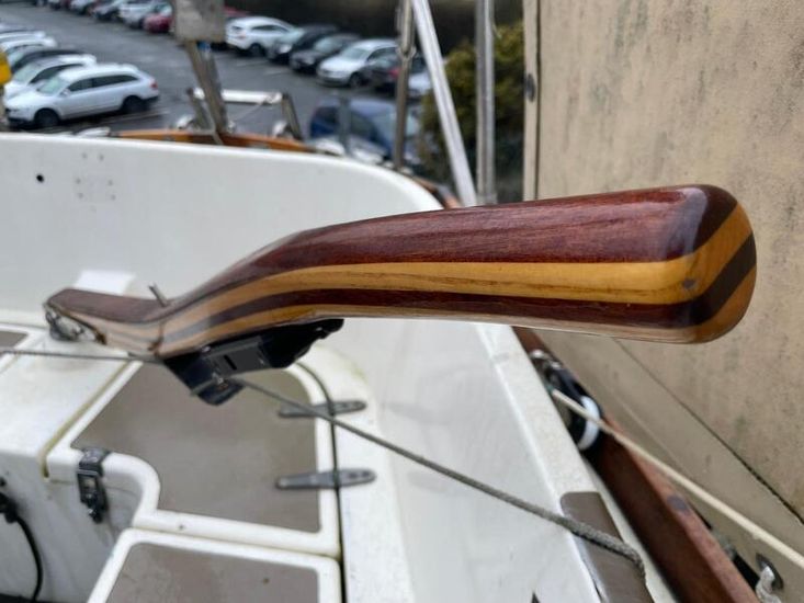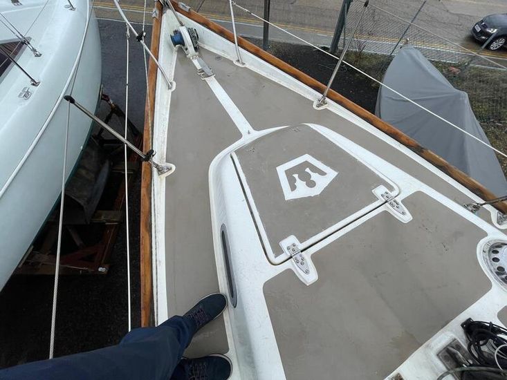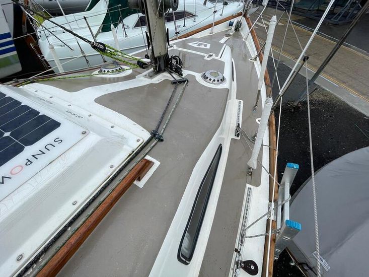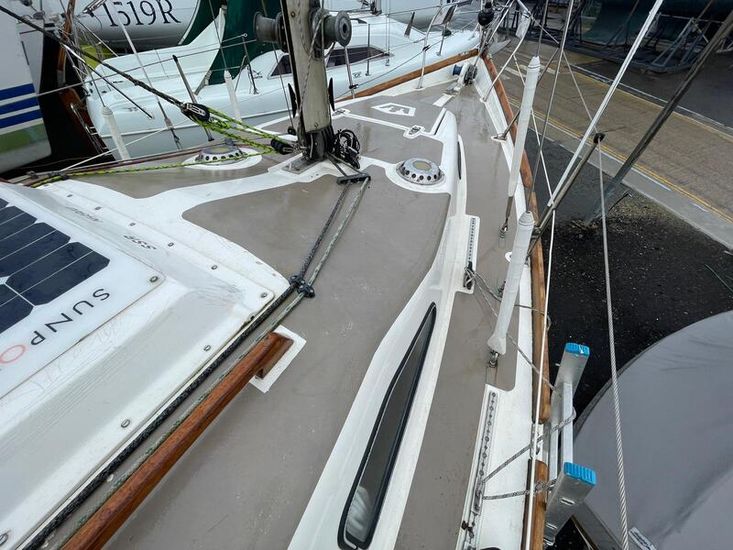 GRP hull and deck, with encapsulated lead keel, plywood washboards, teak toe-rails, and grabrails. Large self-draining cockpit with Teak grating, she has port / starboard cockpit lockers and an aft lazarette. Steered by a wooden tiller (replaced in 2020) with tiller lock. Dodgers and spray hood.