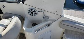 In the cockpit, there is a starboard-side wet bar with a sink, grab rail, and under-sink storage. In addition, you have a Bimini top to keep the sun off of you, plus a kicking stereo to keep everyone entertained. Across the back of the cockpit is a stowable bench that provides extra seating capacity, but when not needed, it stores away neatly. The port side has a seat that folds down flat for when you want to catch some sun on those nice days.