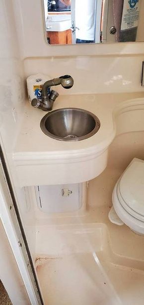 The head is just across from the galley and includes an enclosed compartment with a pull-out wand shower, stainless steel sink, and vacuum flush head.
