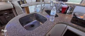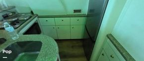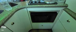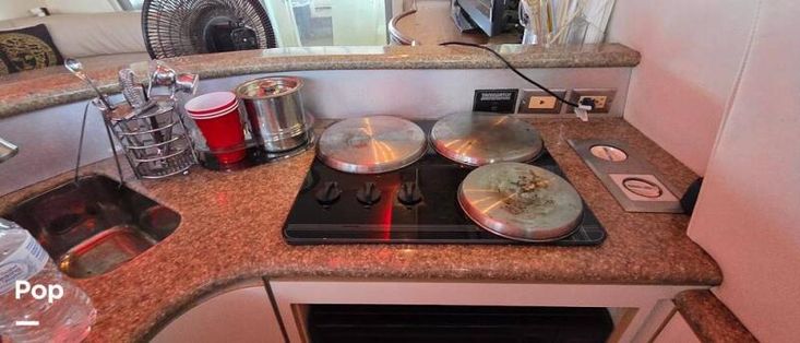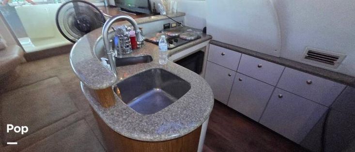 In the galley, you will find a 3 Burner electric range, microwave, full-size refrigerator/freezer/ice maker, coffee maker, sink, dinette, and Corian countertops. The ice-maker is in the salon.