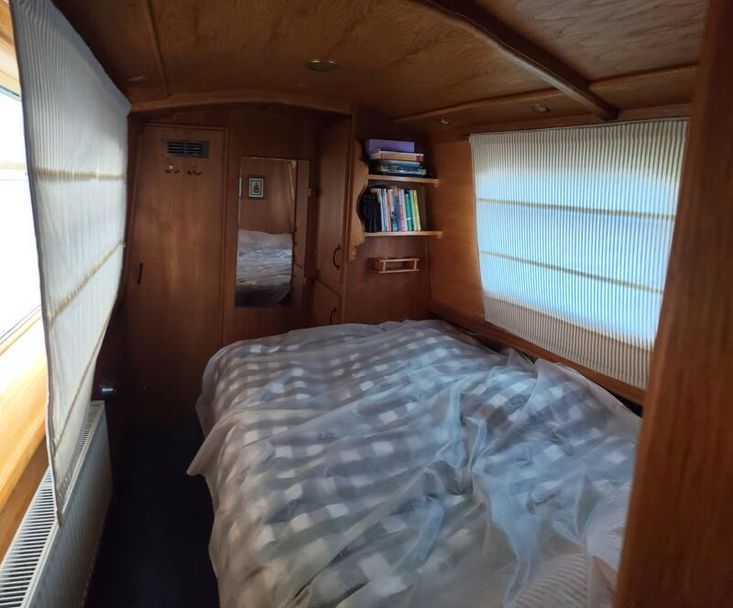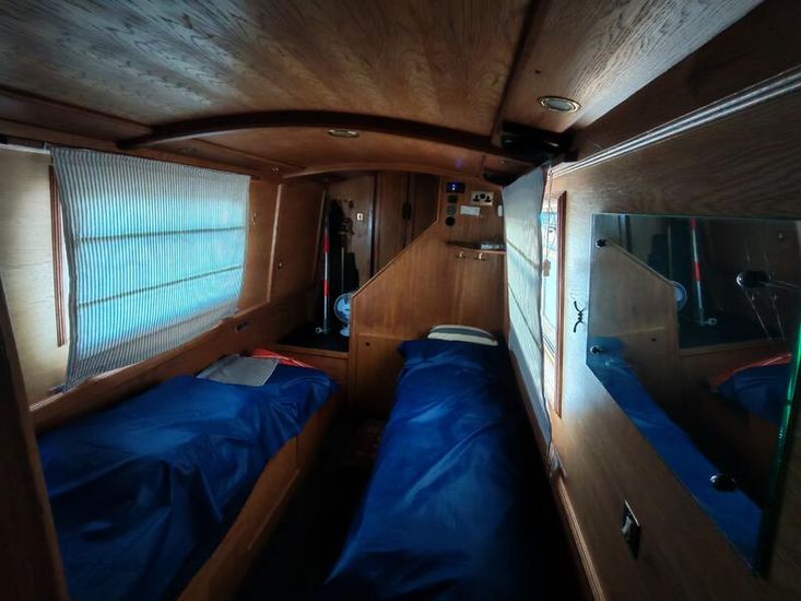 Accommodation is split between two separate cabins, offering flexibility for families or guests. The main bedroom features a transverse double berth with built-in storage, shelving, and a mirror. A second cabin is arranged with twin single bunks, ideal for crew or children. Both sleeping areas continue the wood-panelled theme and are fitted with radiators for comfort.