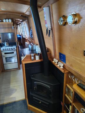 The saloon serves as a comfortable living space featuring an L-shaped dinette area upholstered in dark blue fabric, which is accompanied by a removable table for dining. A solid fuel stove with a visible flue acts as a central focal point and provides substantial heat during cooler months, supplemented by radiators. The room is designed for relaxation and entertainment, boasting a custom-built wooden cabinet unit that houses a flat-screen television and a stereo system, along with open shelving for books and media.