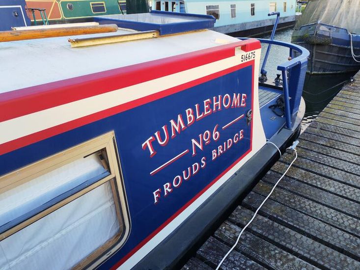 Tumbleholme No6 is a 58ft traditional style narrowboat that presents a classic aesthetic with its blue, red, and cream livery. The vessel is currently moored at Frouds Bridge, as indicated by the stern signage. Power is provided by a Vetus M4.15 diesel engine situated in a tidy engine bay. The interior is lined throughout with warm-toned wood panelling, creating a cosy atmosphere typical of well-crafted narrowboats. For safety, a Dualwatch alarm system is installed to monitor gas and carbon monoxide levels.