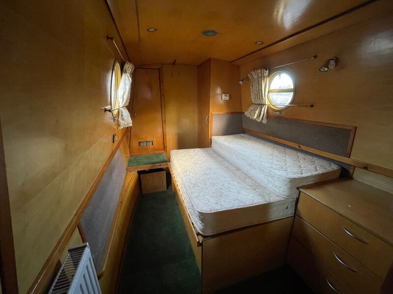 Stepping aboard, you enter the boatman’s cabin, where you’ll find the main control panels for the boat. Moving forward, the first cabin features a built-in double bedroom complete with chest of drawers, a built-in full-height wardrobe, and two portholes providing natural light.
