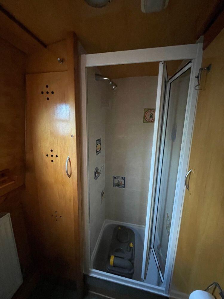 Next is the shower room, which includes a wash basin, cassette toilet, and a shower with a panelled door.