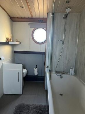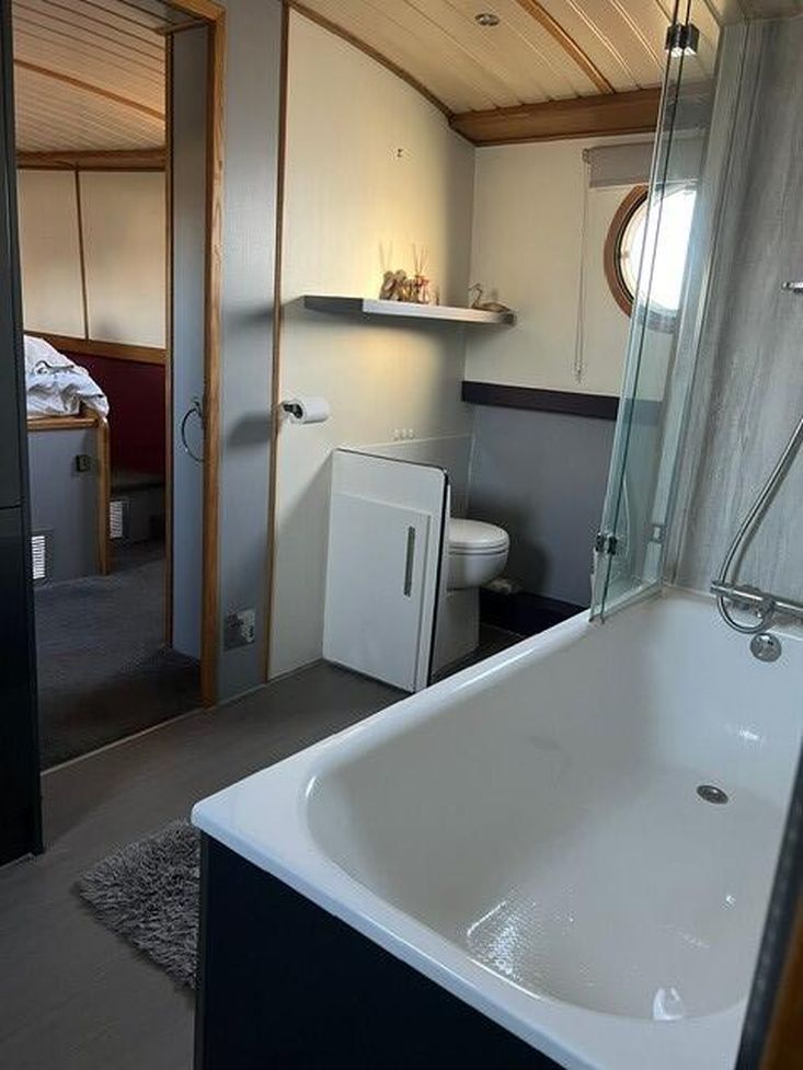 Bathroom: substantial sized bath room, lino flooring for ease with full sized bath for that luxury you always wanted on a live aboard, large folding glass shower screen over the bath with a shower, good sized bathroom sink with storage cupboard underneath and floor to ceiling storage to the side of the sink, electric toilet located at the end of the bathroom, behind the bath is storage currently used for towels and vacuum, mops, spare toilet cassette. Leading to Main bedroom.