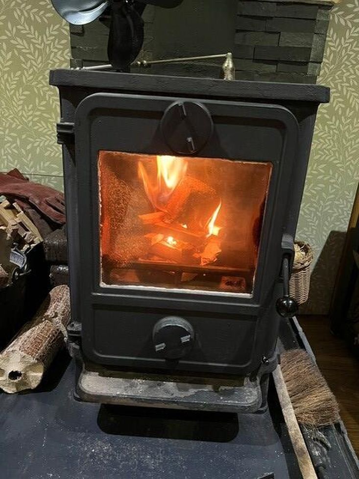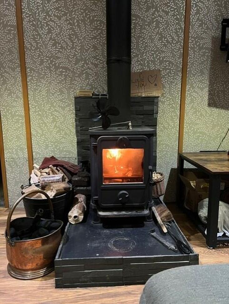 Open plan Lounge area: wood laminate flooring and large corner sofa with ottoman storage stool(included), low side board (included) and a large coffee table with under shelf storage (included), very efficient and attractive squirrel stove with new stones (2025), new rope seal (2025), chimney swept (2025).