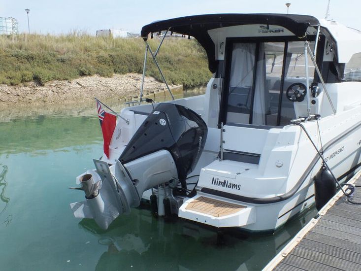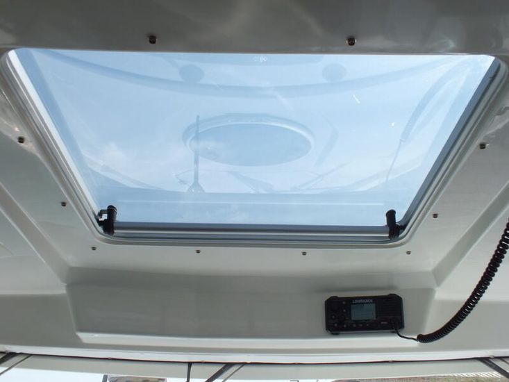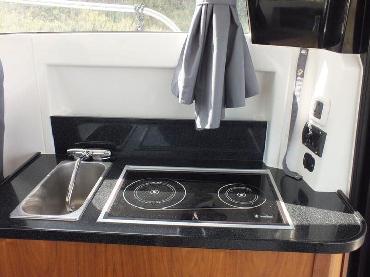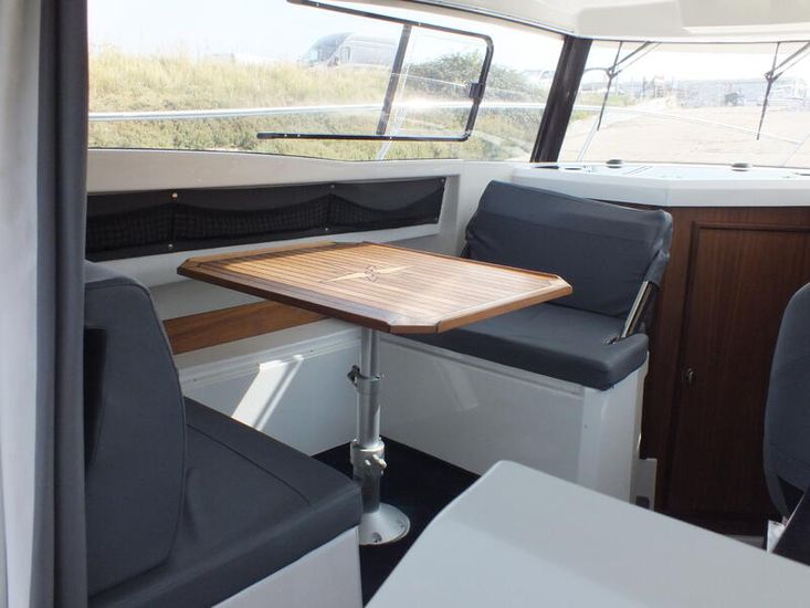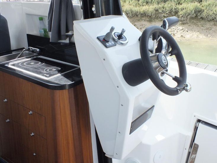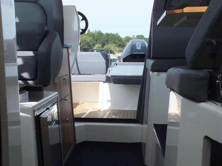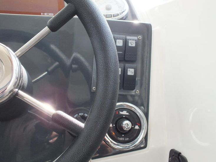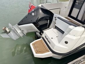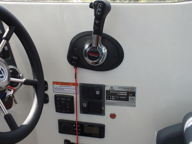 Mercury 300HP V8 (80hrs in use) | Hydraulic steering system | Mercury Vessel View | Fresh water tank | Manual Sea Toilet with holding tank with pump out | Salt water deck wash | Fridge | Wallas Diesel stove | Port Holes | Navigation lights | Curtain package | Auto bilge pump | Manual bilge pump | Boarding ladder | 230L Fuel tank | Outside Helm inclusive of Mercury DTS controls, Bow thruster controls, trim tab controls | Lowrance Premium Pack: (HDS12 Carbon edition, Link 8 VHF DSC radio, Fusion RA70 Bluetooth music system with 2 speakers) |Essential Pack: (Fold down cockpit side benches with base cushions, Fresh water aft shower, Overhead galley storage, Horn, Front screen wash, Aft cockpit seat cushions) | Premium Pack: (Second battery with split charge relay, Bow thruster, Anchor winch with helm control, Shore power) | Canopy | Remote Spotlight | Cabin Teak Table | Hot Water Tank | Diesel Heating System | Trim Tabs | Lowrance outboard drive pilot | Flexiteek cockpit sole and aft decks – Teak colour | Coppercoat Antifoul