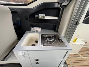 A galley is included: sink, possibly stove/hob, refrigerator (optional or as part of a package) and storage.