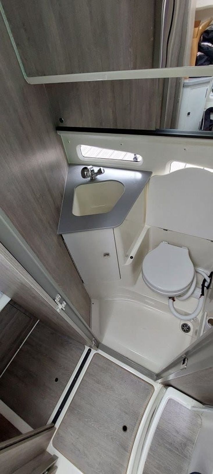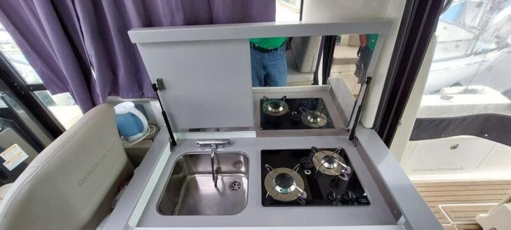 The pull-out shower compartment and sea water toilet are tastefully arranged while skylights provide plenty of natural light in the private master stateroom and private aft stateroom.