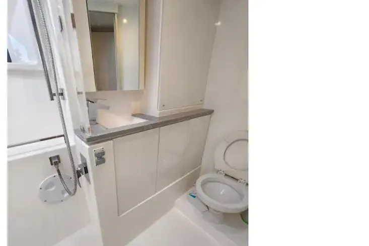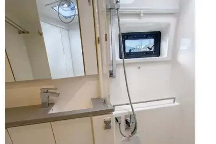 Onboard entertaining is accentuated with ample dining space, and forward facing L shaped seating communicating directly with the galley, situated forward. Wide sliding saloon doors afford panoramic views towards the stern, allowing the interior saloon to flow naturally towards the outside aft and forward cockpit.