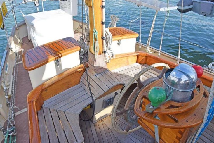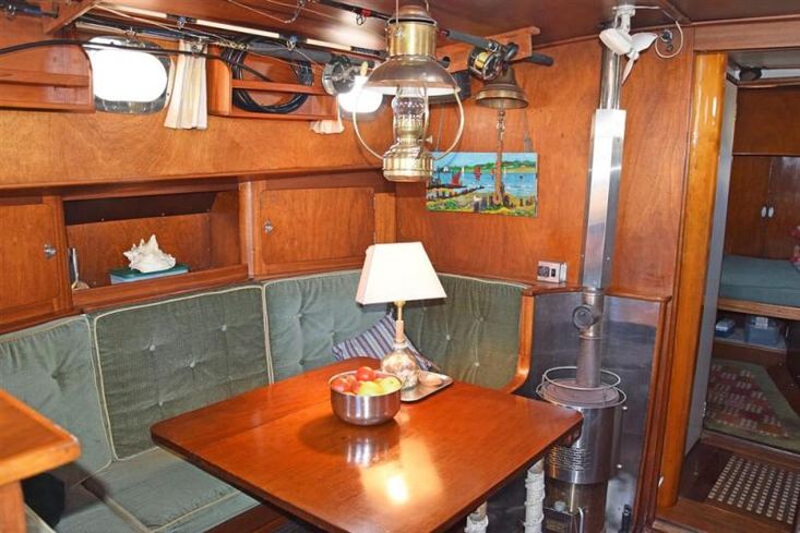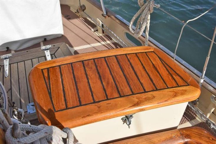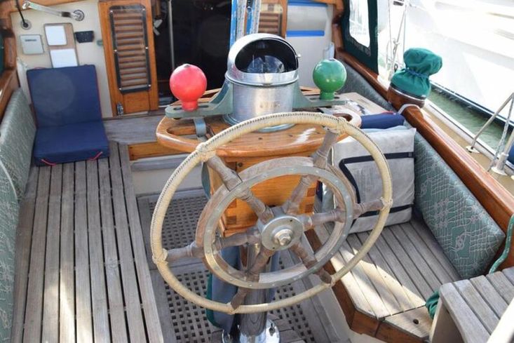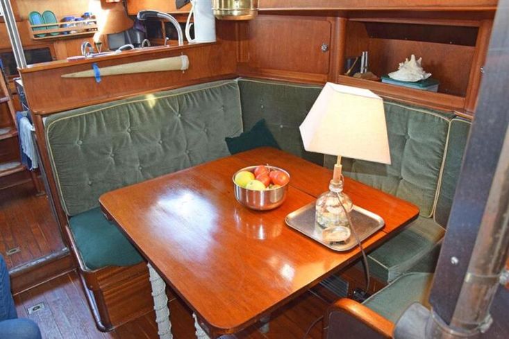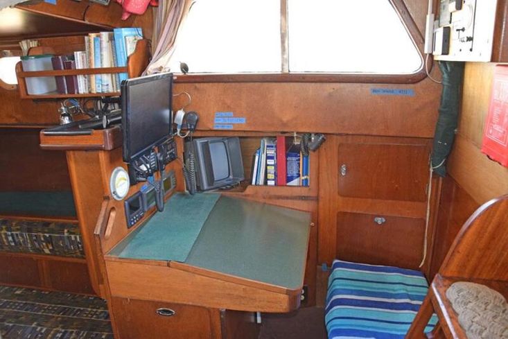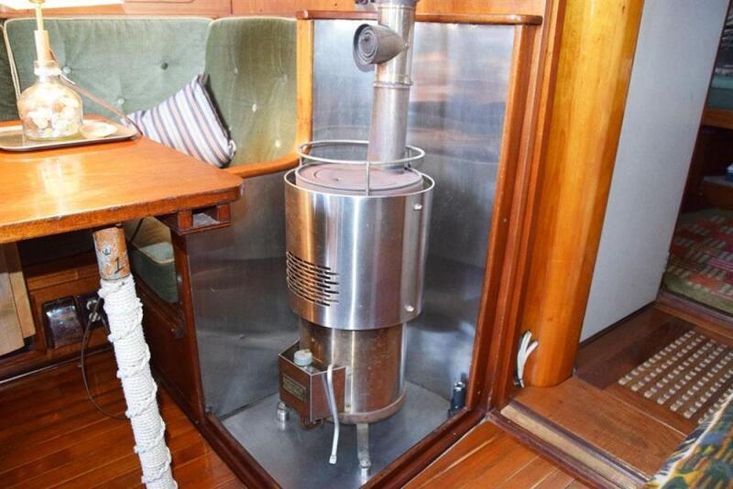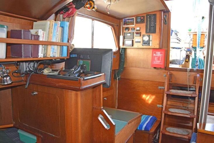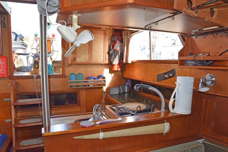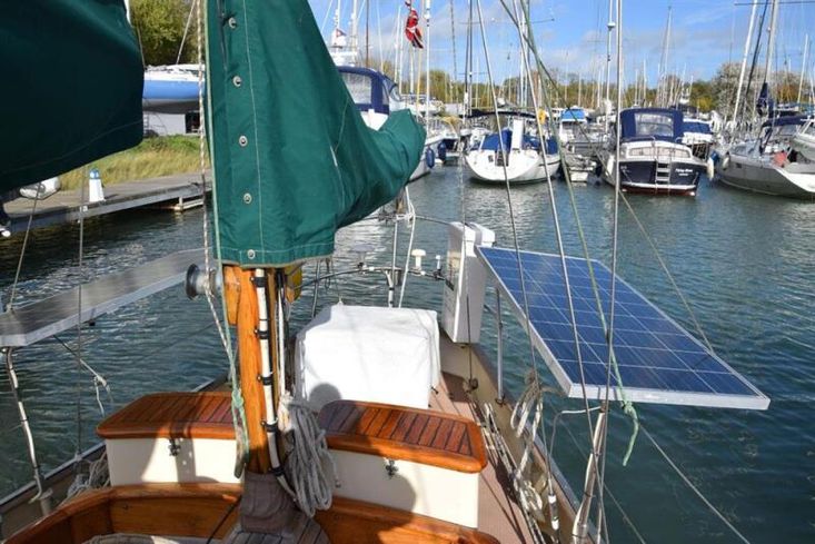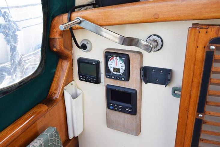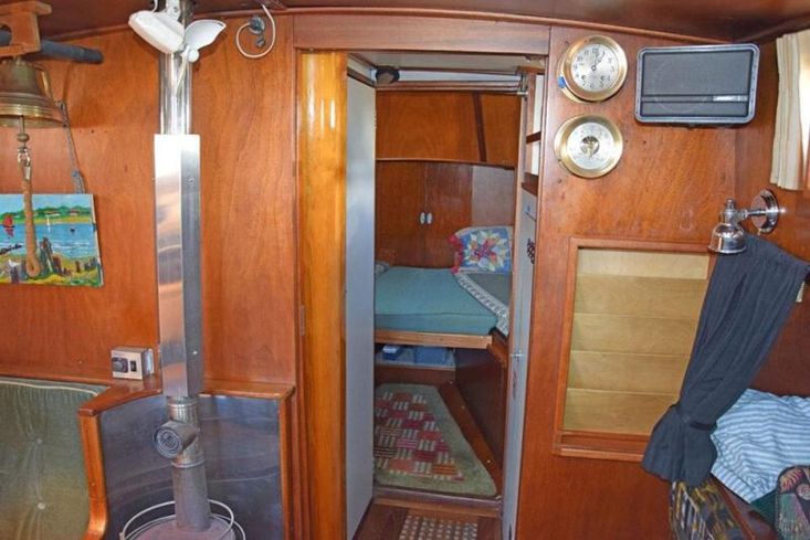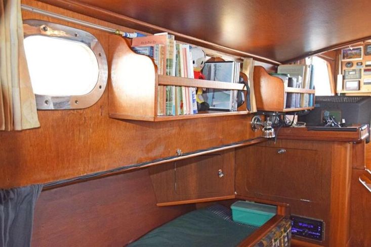 The accommodation is traditionally laid out with up to six berths in two cabins. The layout works well at sea with a wealth of sensible features for seagoing comfort, standing headroom and plentiful stowage throughout. In the forecabin, V berth with infill and stowage under. The berth can be used in either fore an aft or athwartships configuration providing two secure singles on passage or a comfy double at anchor. Sliding doors open to reveal the forepeak which offers a large stowage space for sails, chain, outboards and other sundry cruising gear. Opening hatch to deck. Separate heads compartment to port with marine WC, shower and washbasin. Holding tank. Interestingly, the washbasin is made of monel and comes from a WWII ship. There is a hanging locker opposite the heads. In the saloon, dinette to port with settee berth opposite. The dinette will convert to a double and there is also a secure pilot berth to starboard. Saloon table with one drop leaf and one removable leaf. Brass ship's bell. Brass 'Trawler' lamp. Dickenson Antarctic diesel cabin heater. Kenwood radio/CD player with Bose speakers. (Please note the painting, brass clock and barometer are personal items of the owner and are not included in the sale.) Moving aft, the good-sized chart table is to starboard and offers plenty of space for electronics display and book and chart stowage. Opposite is the galley. Force 10 three burner gas cooker with grill and oven (the oven is not working so the whole unit will need replacing). Twin stainless steel sinks with hot and cold pressurised water supply. Spectra 60 lph watermaker. 590 litre freshwater capacity in two tanks. Manual back up pump. Saltwater pump. Top loading fridge/freezer. The hull is fully insulated keeping the boat pleasantly warm in winter and nicely cool in summer. There are two dorade ventilators and fans throughout to provide good ventilation in bad weather.