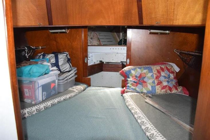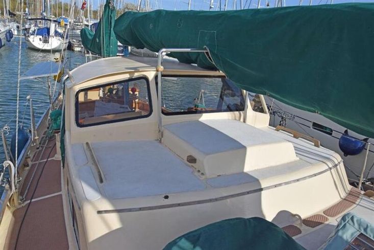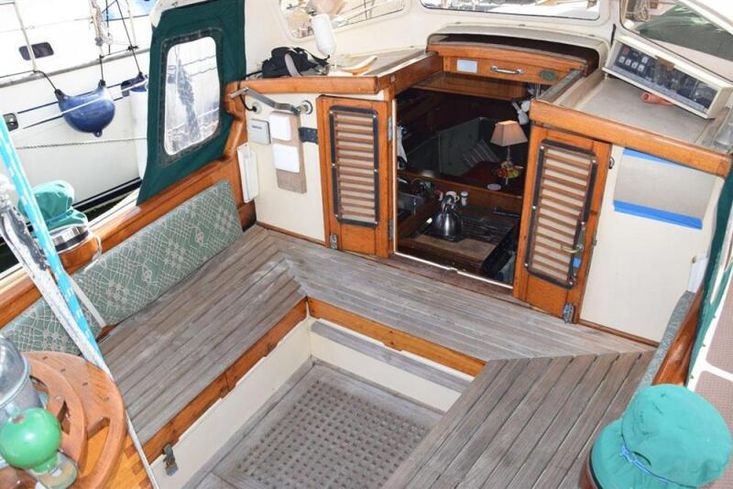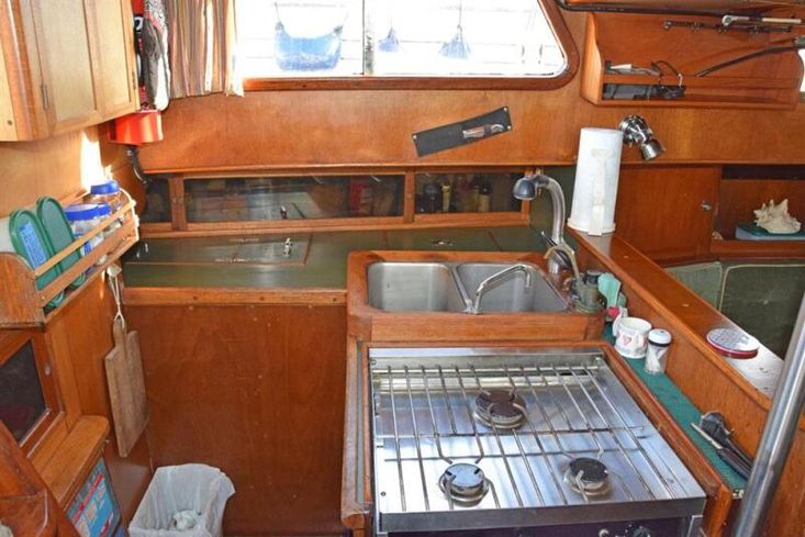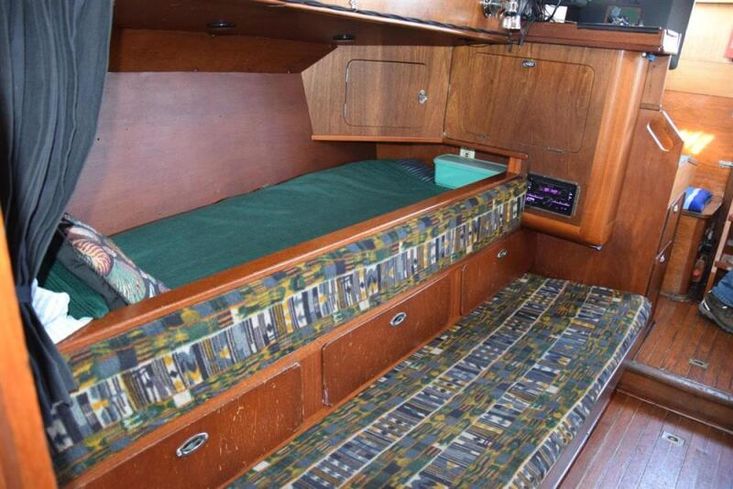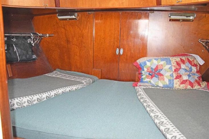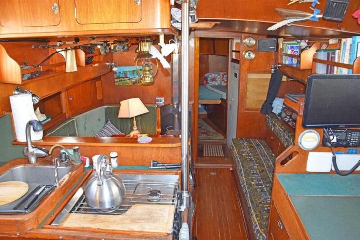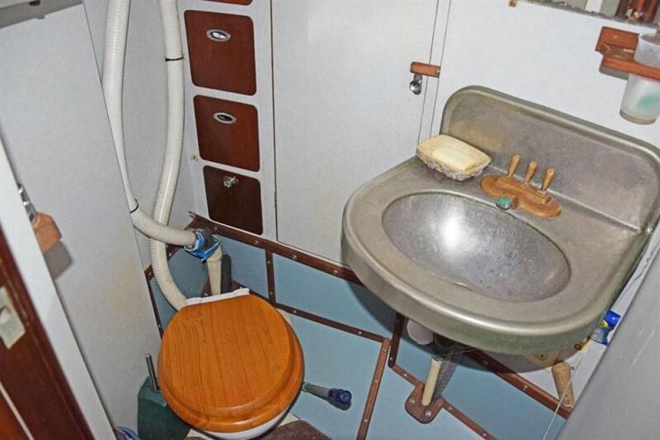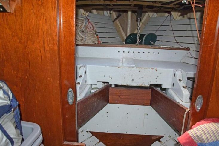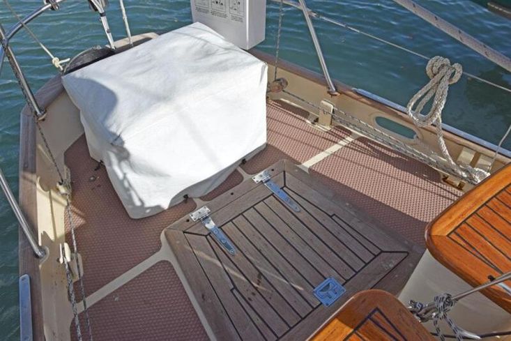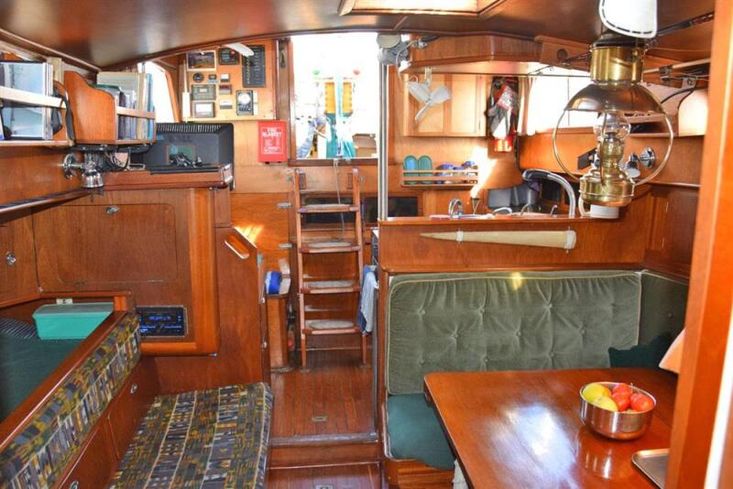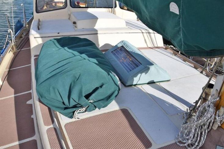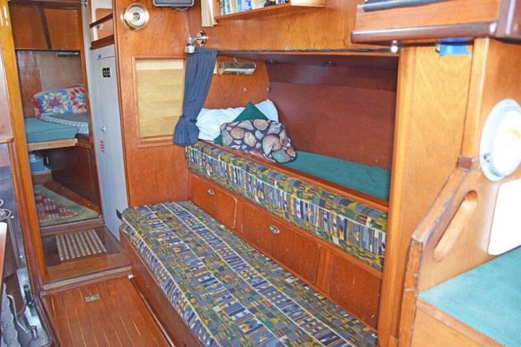 The accommodation is traditionally laid out with up to six berths in two cabins. The layout works well at sea with a wealth of sensible features for seagoing comfort, standing headroom and plentiful stowage throughout. In the forecabin, V berth with infill and stowage under. The berth can be used in either fore an aft or athwartships configuration providing two secure singles on passage or a comfy double at anchor. Sliding doors open to reveal the forepeak which offers a large stowage space for sails, chain, outboards and other sundry cruising gear. Opening hatch to deck. Separate heads compartment to port with marine WC, shower and washbasin. Holding tank. Interestingly, the washbasin is made of monel and comes from a WWII ship. There is a hanging locker opposite the heads. In the saloon, dinette to port with settee berth opposite. The dinette will convert to a double and there is also a secure pilot berth to starboard. Saloon table with one drop leaf and one removable leaf. Brass ship's bell. Brass 'Trawler' lamp. Dickenson Antarctic diesel cabin heater. Kenwood radio/CD player with Bose speakers. (Please note the painting, brass clock and barometer are personal items of the owner and are not included in the sale.) Moving aft, the good-sized chart table is to starboard and offers plenty of space for electronics display and book and chart stowage. Opposite is the galley. Force 10 three burner gas cooker with grill and oven (the oven is not working so the whole unit will need replacing). Twin stainless steel sinks with hot and cold pressurised water supply. Spectra 60 lph watermaker. 590 litre freshwater capacity in two tanks. Manual back up pump. Saltwater pump. Top loading fridge/freezer. The hull is fully insulated keeping the boat pleasantly warm in winter and nicely cool in summer. There are two dorade ventilators and fans throughout to provide good ventilation in bad weather.