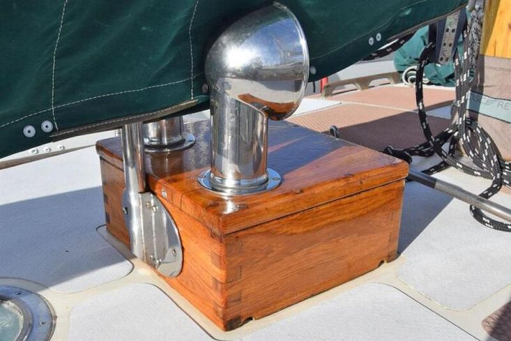 Fractional rigged yawl. Varnished hollow spruce spars. Stainless steel standing rigging (2022). Terylene running rigging (2019). Slab reefing mainsail with lazyjacks. Slab reefing mizzen. Self-tacking working jib with boom. Two Andersen 52 self-tailing sheet winches. Two Andersen 48 self-tailing halyard winches. Two Barlow control line winches. Andersen 28 self-tailing reefing winch. Telescopic jib boom.