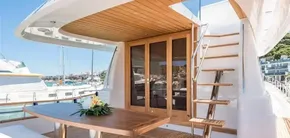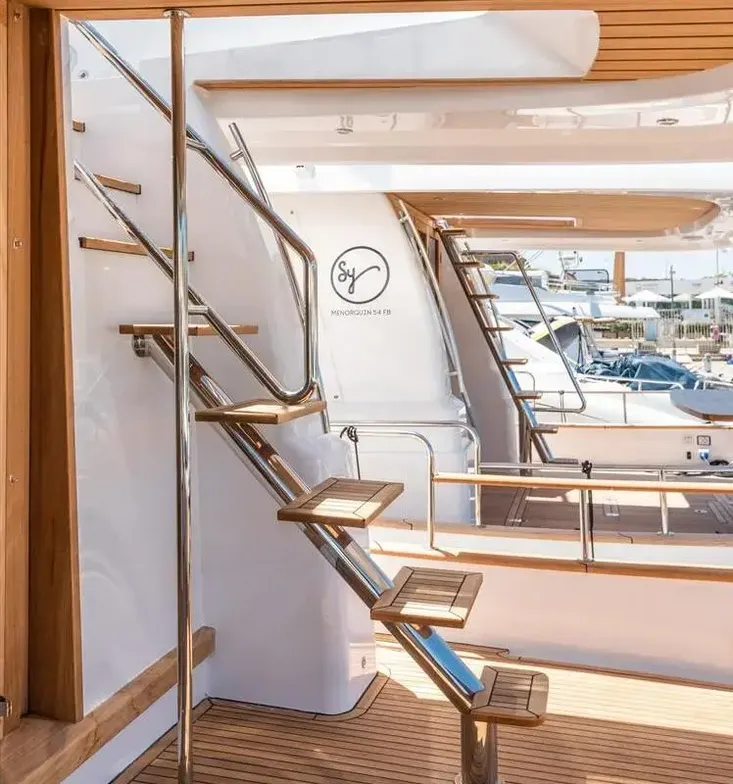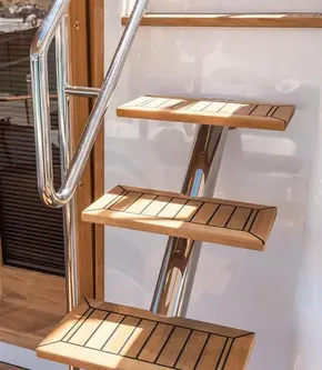 - Stainless steel and teak access stairs to Flybridge