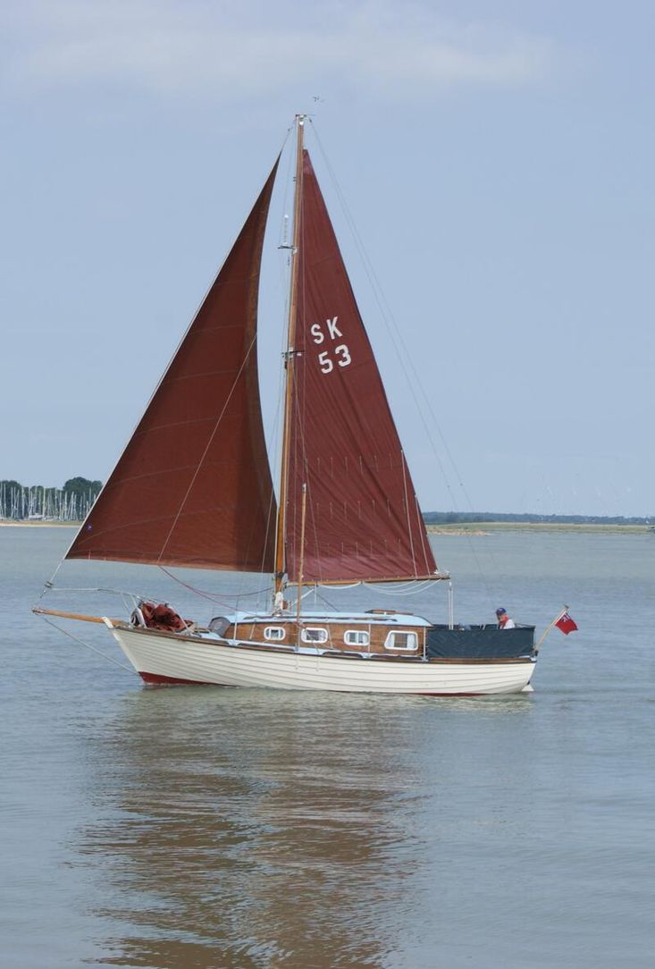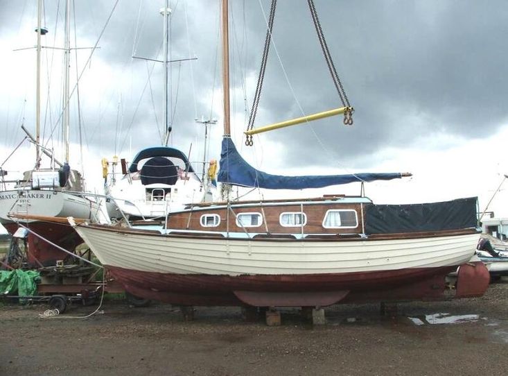 Construction is of clinker Iroka planking on oak ribs and frames, she has a long lead ballast keel and bilge keels, a 20hp Perkins 3 cylinder fresh water cooled diesel engine with “Vetus” exhaust system which was installed in 2011 has less than 130 hours running time, control panel R.P.M., temperature and Oil temp, Morse throttle/gear lever with Technodrive gear box, shaft drive and propeller (new 2011), “Sillette” prop protector, a 40 litre fuel tank. Aluminium “Kemp” mast & boom and Wooden bowsprit, Sails are tan, “Jeckels” Mainsail with slab reefing, “Dolphin Sails” Furling Genoa good /reasonable condition, the interior has 4 berths in 2 cabins with 5’3” headroom in the main cabin, Galley has small sink/drainer whale fresh water hand pump approx 45 litre PVC water tank, 2 ring “Calor” gas hob, grill and oven gas connections renewed 2012 (Hose dated 2011) Fire blanket, 1kg powder Fire extinguisher, 4?5kg “Calor” Gas bottle in a sealed box aft vented overboard, charcoal burner cabin heater, “Jabsco” marine toilet, mainsail cover, cockpit cover, Hull colour “Pearl White” Main anchor 15kg plough & 27mtrs ?″galvanized chain, Kedge anchor 7½ kg Britany Lincoln 4½ mtrs 6mm chain & 16 mtrs 12mm multiplat rope. Last surveyed 6th August 2012.