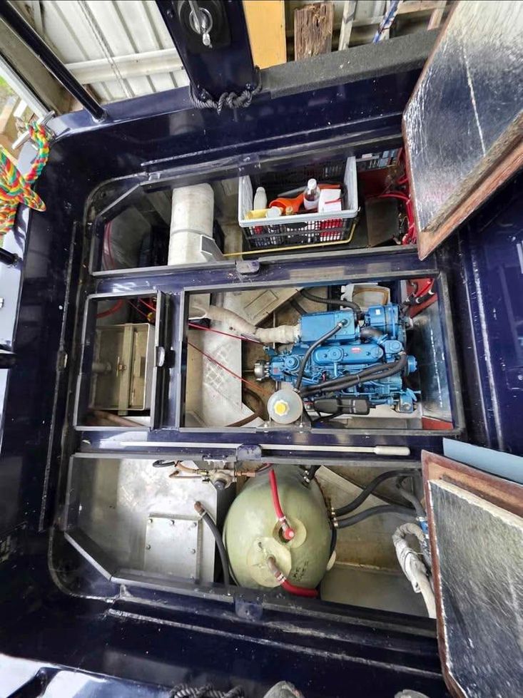 Engine bay includes storage for starter, 2 leisure batteries and Sterling battery charger as well as diesel tank and access to bilge pump and the weed hatch.