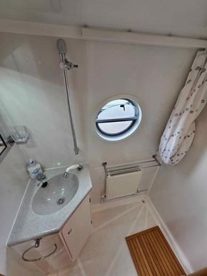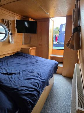 To the rear of the boat is a bedroom with fixed double bed with the complete area of the bed having storage underneath. Large wardrobe, floor mounted cupboard and 2 wall mounted cupboards add to the storage on offer. There is a mirror with light above the floor mounted cupboard for use as a dressing table as well as a plug socket for use when on main electric. 2 lights above the bed independently controlled allow for reading in bed. Double radiator and TV bracket add to the comfortable bedroom. 2 half-moon porthole windows with curtains add to the privacy whilst sleeping. Central heating control mounted on the wall. There is also a fixed porthole window on the corridor leading to the bedroom.