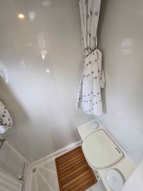 The front lounge area has galley style seating for 6, featuring an optional 4-seater dining table (included). The seating area converts easily into a large sleeping area using pull out centre piece. Ample storage is provided by 2 large lockers under the benches which also allows access to the Vetus Bow Thruster and Jabsco Water Pump and Filter. Other storage includes a 4-drawer unit below the TV and a lift lid cupboard. A wall mounted TV bracket for a TV with 12V supply and 2 plug sockets below. A built-in stereo which has 4 speakers to the roof completes a great entertainment area. In the centre of the lounge is a clear skylight which can be opened to varying heights. 6 centrally positioned vents in the roof allow for circulation of air without letting the rain in. All the carpets and upholstery have been recently cleaned.