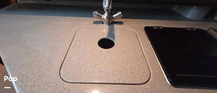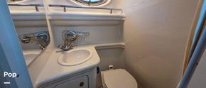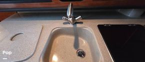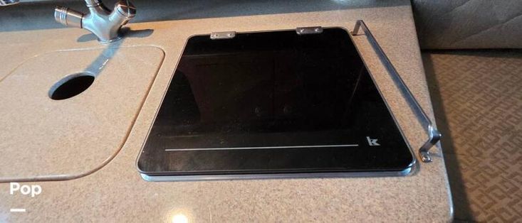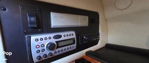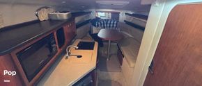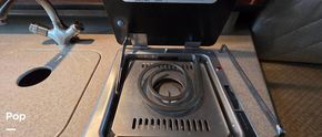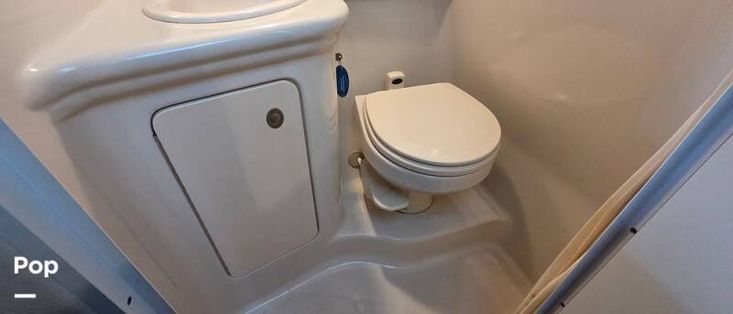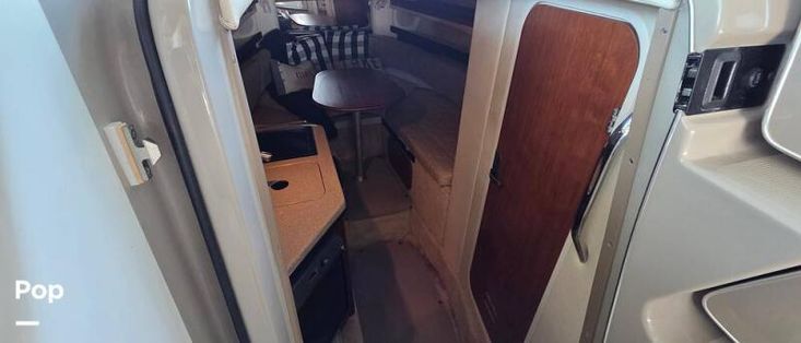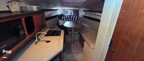Below deck, the cabin is clean and well laid out for a boat this size. There's a forward V-berth that converts to a sleeping area, a mid-cabin berth, a compact galley, and an enclosed head. It's perfect for weekend trips, overnight stays, or just getting out of the sun during the day.