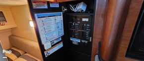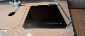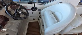 Up top, the cockpit layout is very comfortable with plenty of seating for family and friends. The helm is easy to reach and laid out well, and there's good visibility all around. The boat also has a full enclosure, which is great for shade, wind protection, or extending your boating season when the weather isn't perfect.