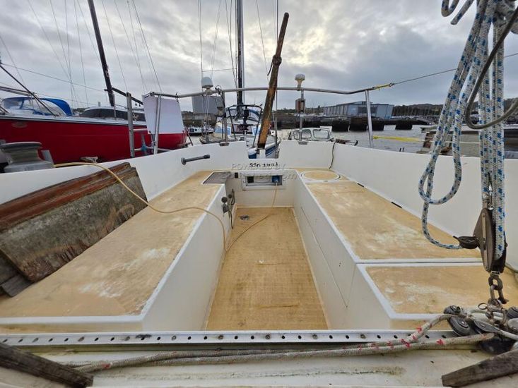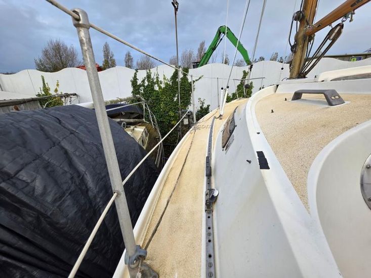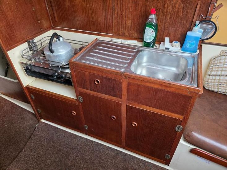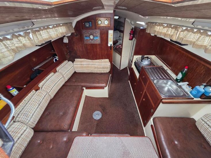 She has a roomy well-finished interior with 5'10" headroom. There are 2 berths in the forward cabin with an infill to convert to a double. The heads are to port with a hanging locker opposite. In the main saloon, the galley is starboard with a quarterberth leading aft.