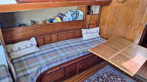 Saloon - The main cabin with dinette to port converting to a double berth with single settee berth opposite. Lockers and shelving above to port and starboard. The saloon table converts to the port double.