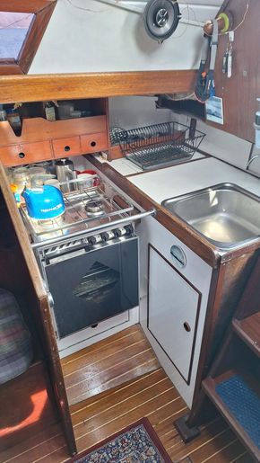 Galley - The refurbished galley is to starboard aft and has ample storage with built in cool box. A single sink is served by pressurised fresh water.