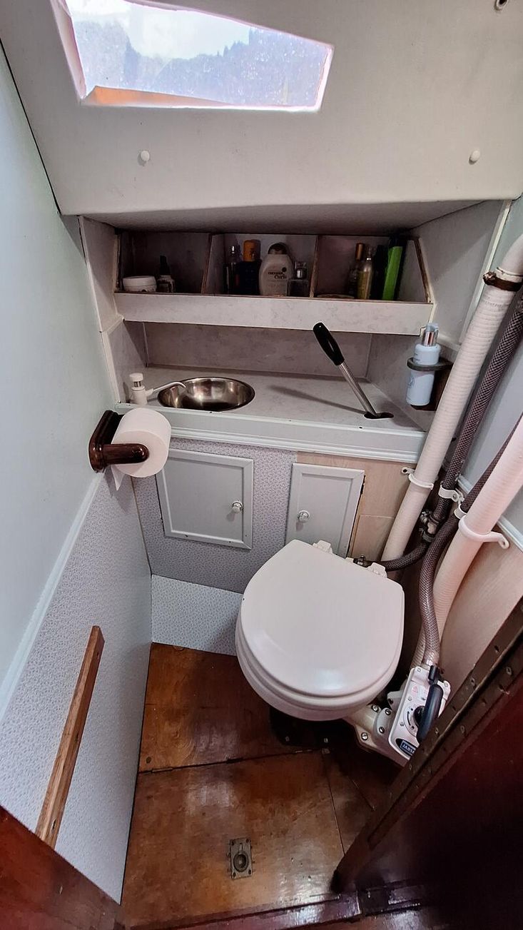 Heads - Separate heads compartment to port with Jabsco sea toilet and pressurised fresh water sytem to a stainless steel sink. There is a hanging locker opposite.