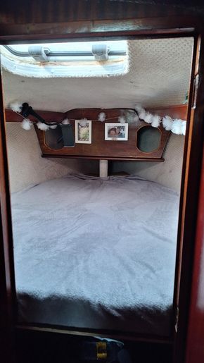 Forward Cabin - 'V' berth with stowage under and opening deck hatch for light and ventilation.