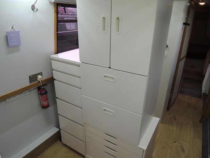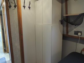 Bedroom in enclosed bow has full width bed, gas struts for easy access to storage under, wardrobe and side doors with hatch over.
