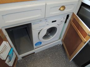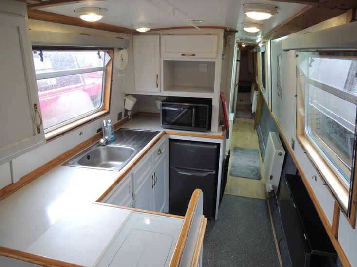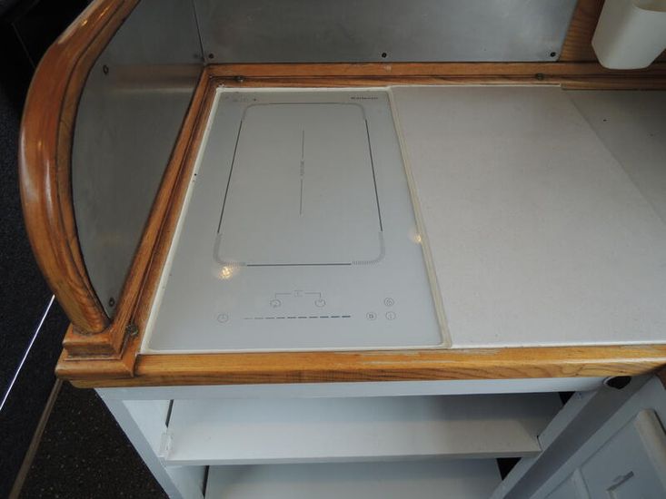 Galley is U-shape and gas free with Induction hob, Microwave, 240v fridge/freezer and candy washing machine.