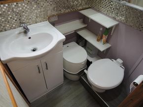 Bathroom is off corridor with Hip Bath, vanity sink unit, Mansfield style Pumpout toilet & a spare Porta potti toilet.