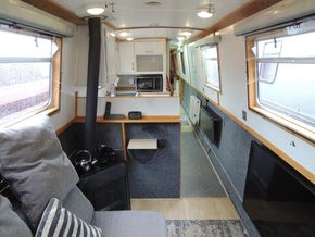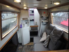 Entry from the pram covered cruiser stern into Saloon with corner diesel stove, wall mounted Tv and 2 seater sofa.