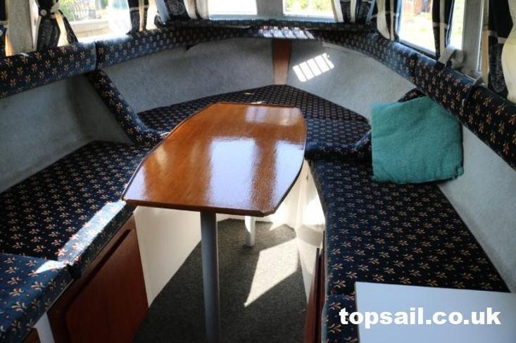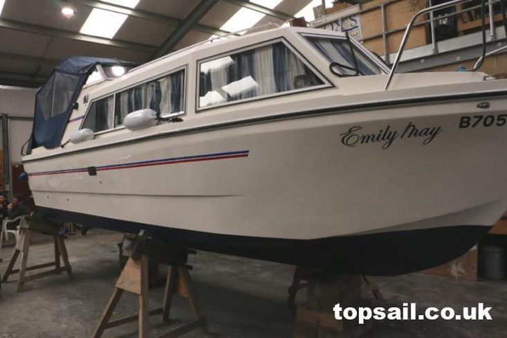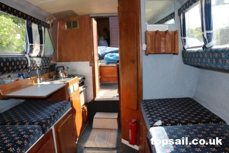 The owners comment: “Emily May was purchased by our family in 2005 and we’ve had many good times in her on the Broads. She’s been washed and polished every year and antifouled every 2 years. The gelcoat has some blemishes & marks but we think is a good example for a boat of its age. The internal condition is very good. Furnishings have always been removed and stored ashore all winter. The engine starts easily and runs very smoothly. Seating upholstery is in good condition but the curtains need replacing and are getting tired”.
