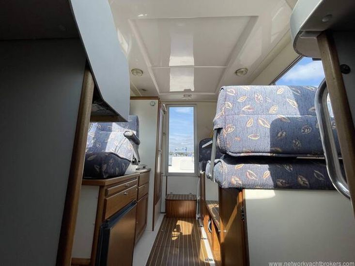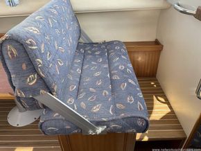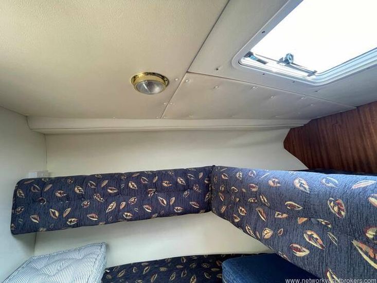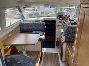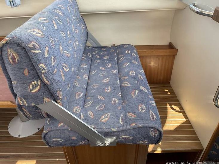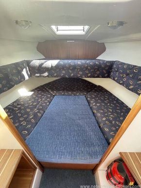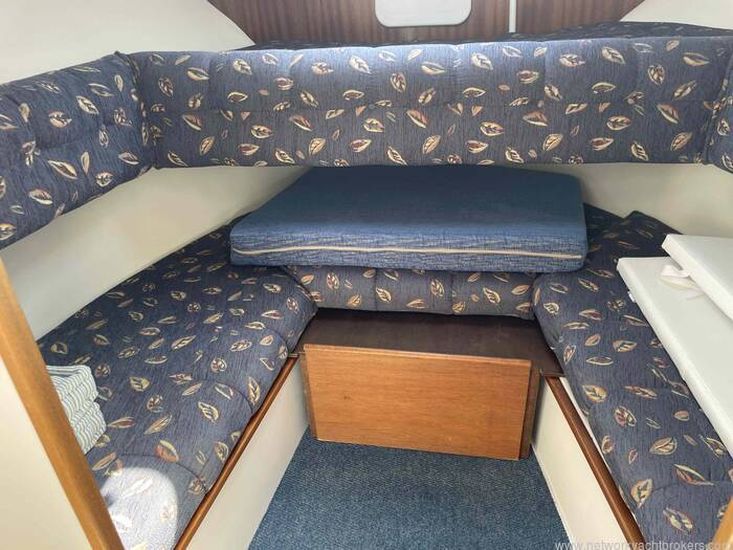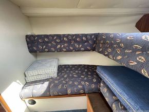 Dinette to port that can seat four. The table can drop to convert into a double berth (no cushion). Helm station with seat to starboard and crew seat opposite to port. Hanging locker and curtains.