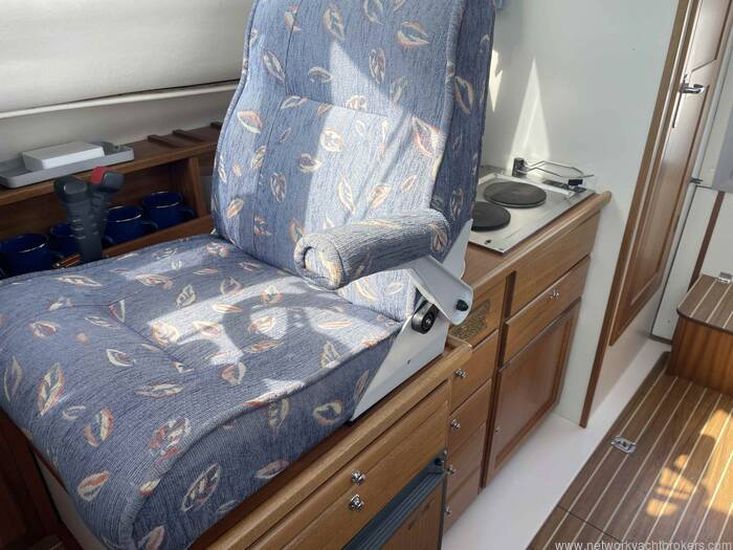 Galley: is aft of the helm to starboard, two burner paraffin cooker, stainless steel sink, pressurised hot/cold water, 12V. fridge and loads of storage lockers and drawers.