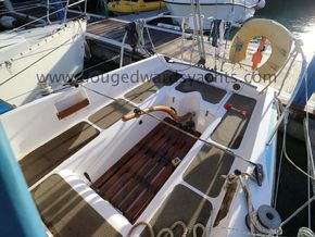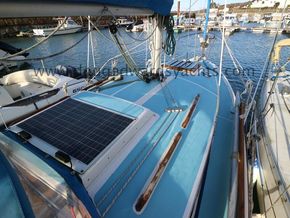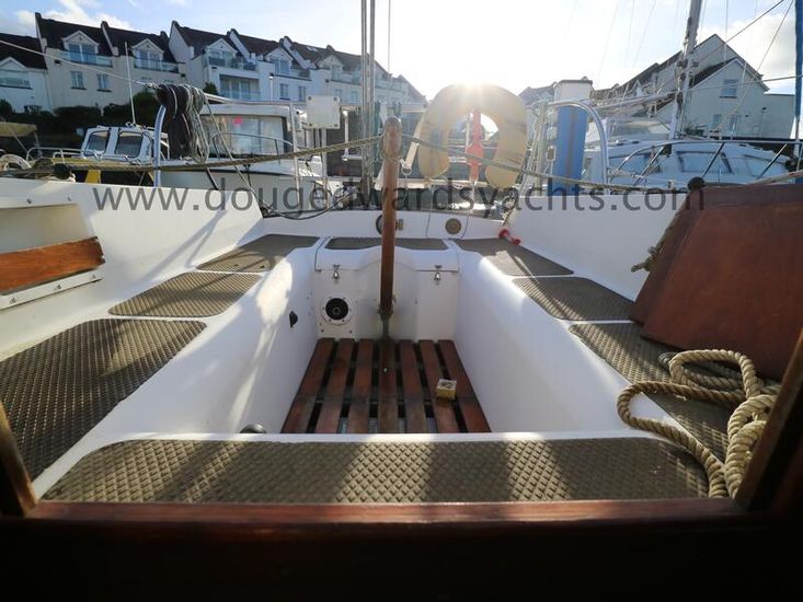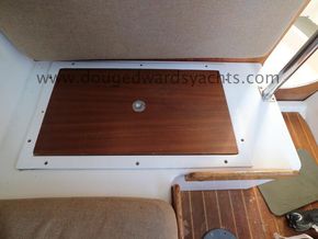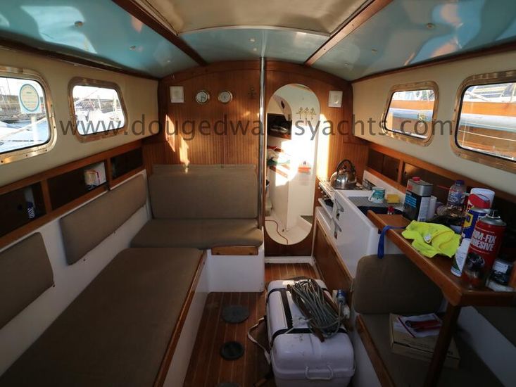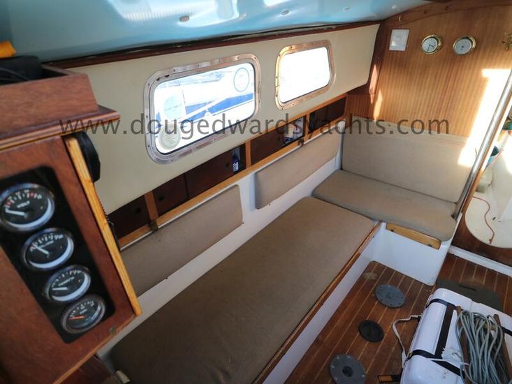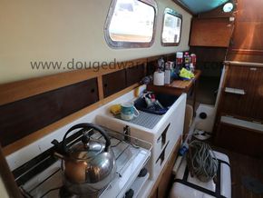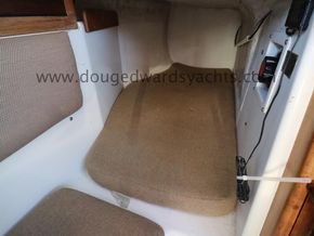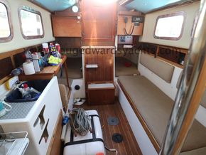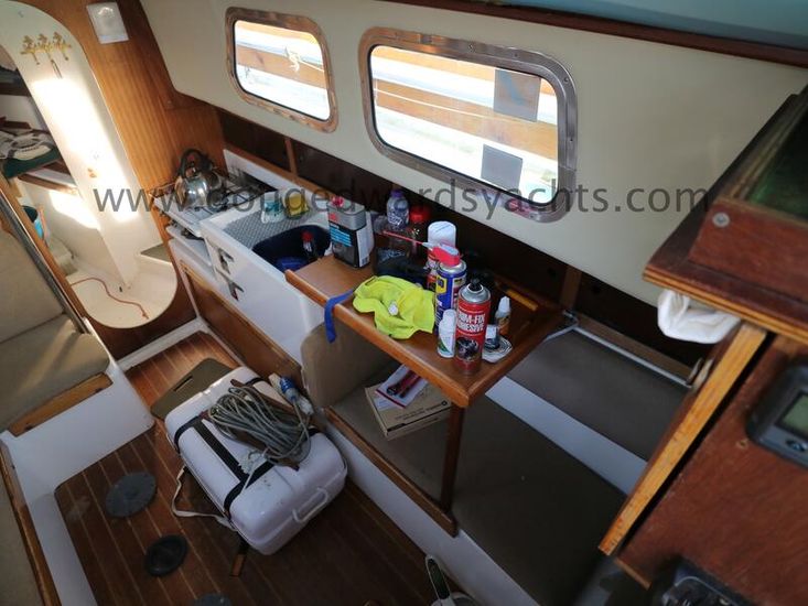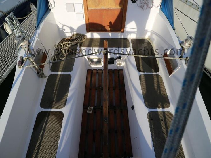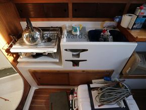 The private forecabin has a double V berth. There is a marine wc to port and a hanging locker opposite. The saloon has a single settee berth (double berth conversion) with a dining table and two quarter berths aft. The galley has an two burner gas stove with grill, a cool box and a sink with foot pumped cold fresh water.