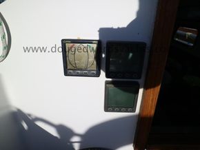 Through bulkhead compass. Garmin GMap276. AIS transceiver. Nasa wind instrument (2018). Nasa speed log and depth instruments. Icom IC-M323G DSC VHF radio. Clock and barometer. Navigation lights.
