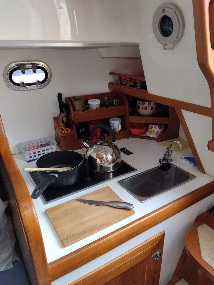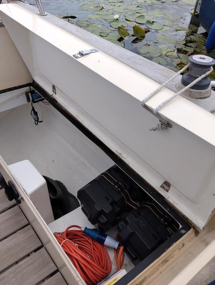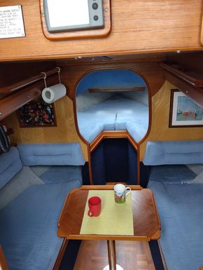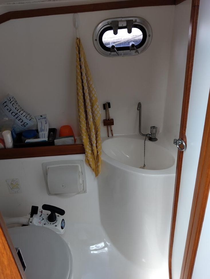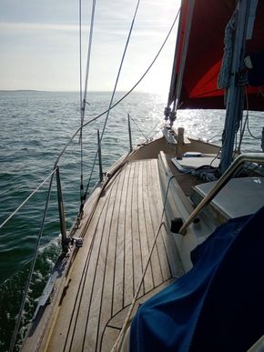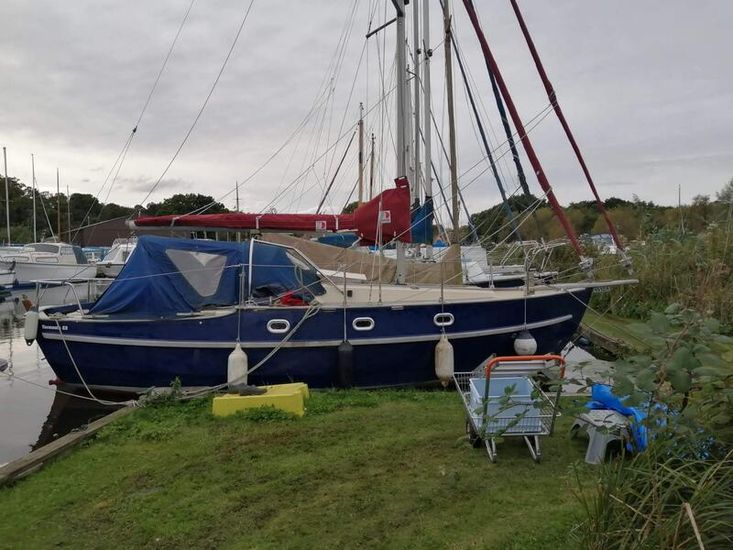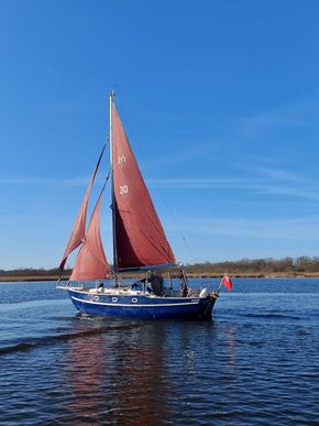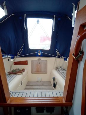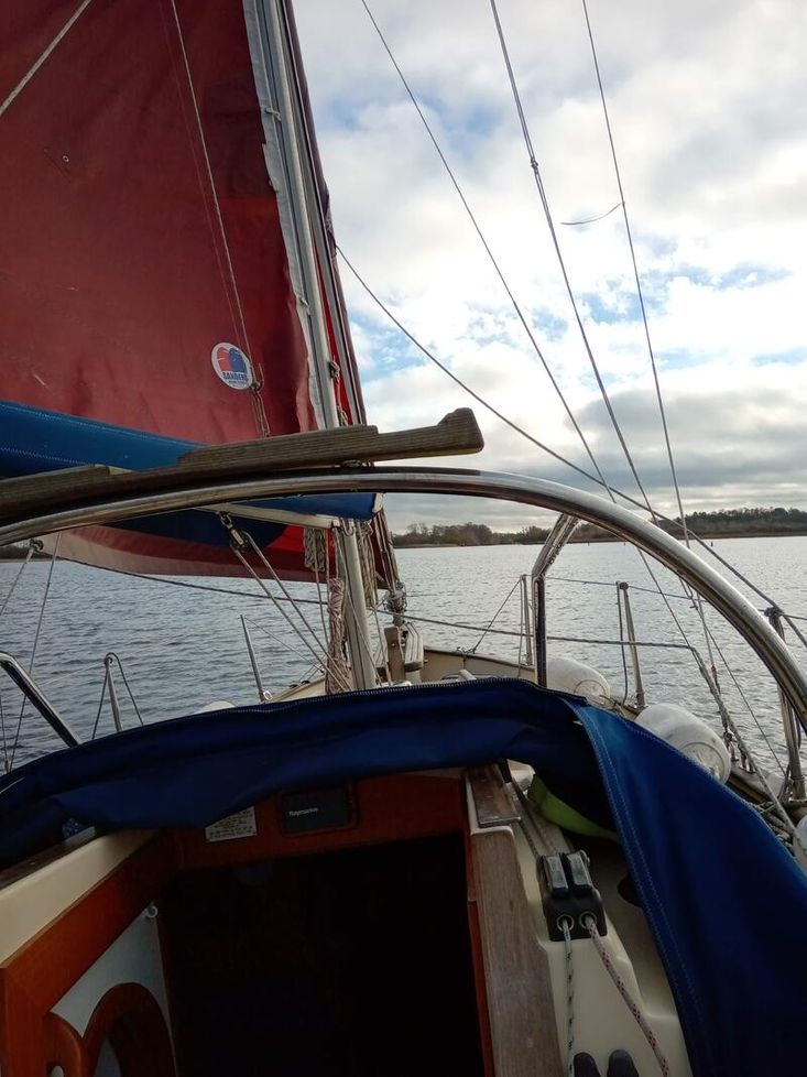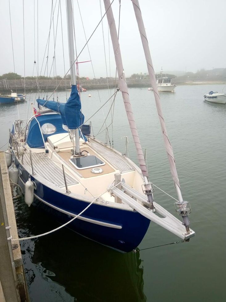 Sturdy and seakindly like the Fisher range ( same design team). In all weathers Bluebell feels safer than many larger boats. The Bermudan rig gives better windward performance and easier sail handling. GRP hull built in Sri Lanka with local teak decking and joinery, finished by Yarmouth Yacht Services. Laid up ashore for 7 years whilst her first owner was abroad, she has since been sailed on the Solent and East Coast. With a long keel but shallow draft she is ideal for both the open sea and coastal cruising. Good headroom and a sensible layout below decks. Definitely a head-turner, she has been a pleasure to own.